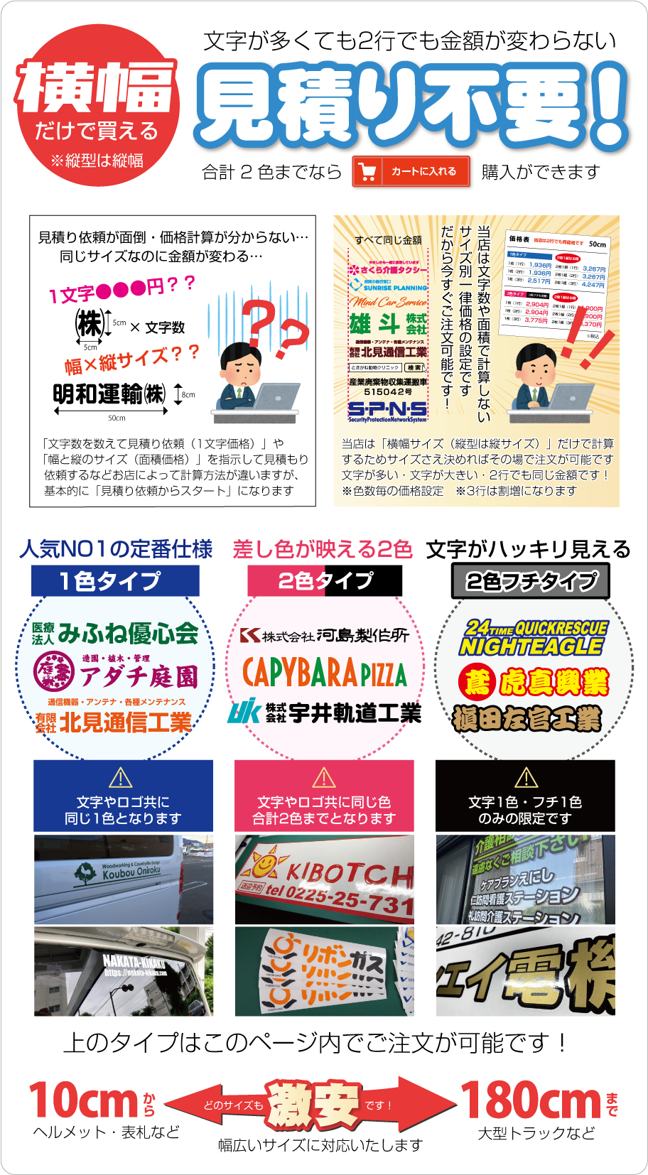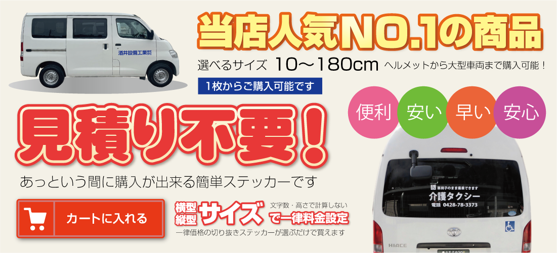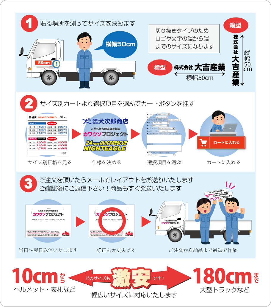 ■お見積りの際は必ず「サイズ・数量・色数・希望事項など」をお知らせください。「軽トラックや2tトラックサイズ」などで指定を頂 い てもサイズの確定が当店で出来ません。貼る場所を決めて「必ず希望サイズ指定」をお願いします(幅か高さの一方で大丈夫です。※高さに制限がある場合は〇〇cm以内などもご指定下さい)なお1シートで出せるサイズが長い方2m×短い方57cmとなります。