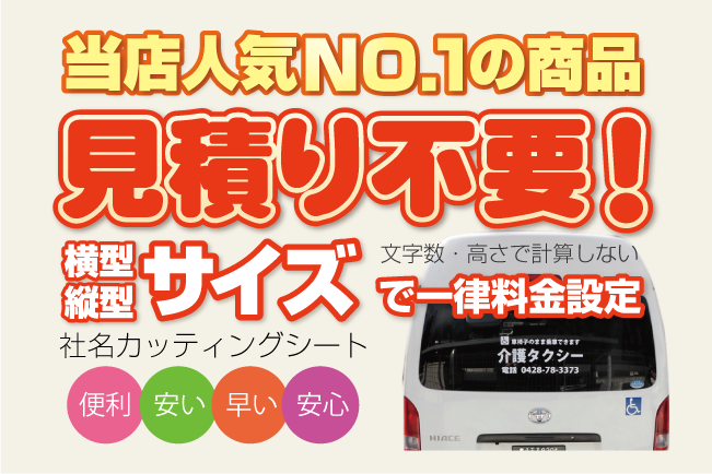 ステッカー 営業車・トラックに社名を入れたいけど見積り依頼は面倒だというお客様、1・2色なら「見積り不要の大吉堂」にお任せ下さい。「文字数や高さ」で金額が変わらないサイズ毎の一律価格です。
