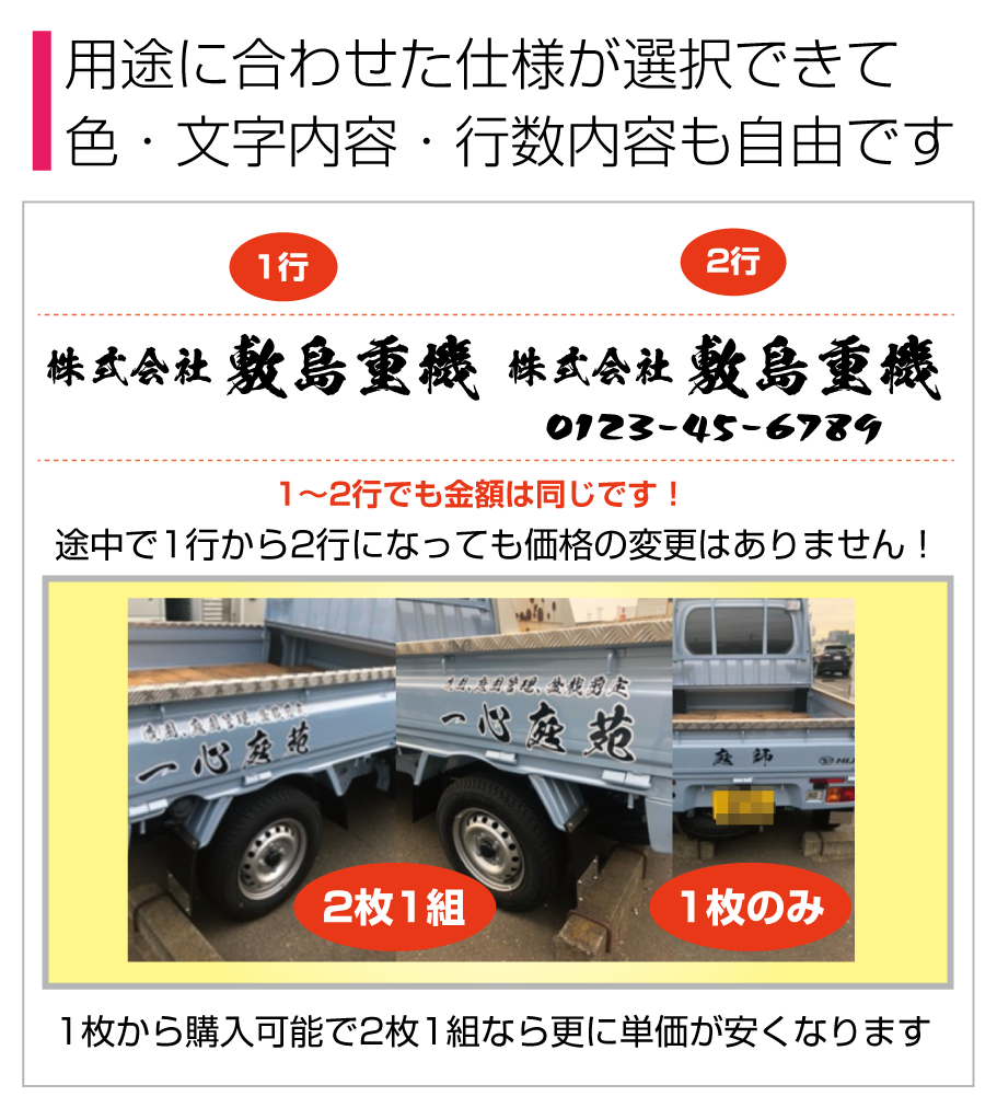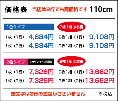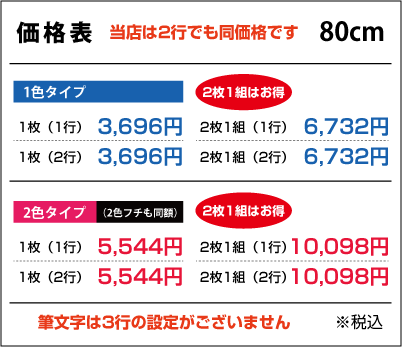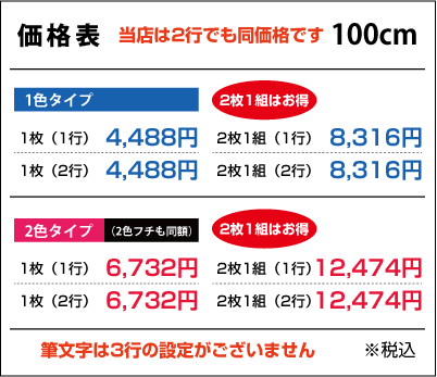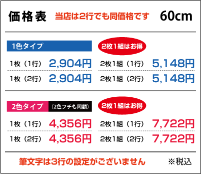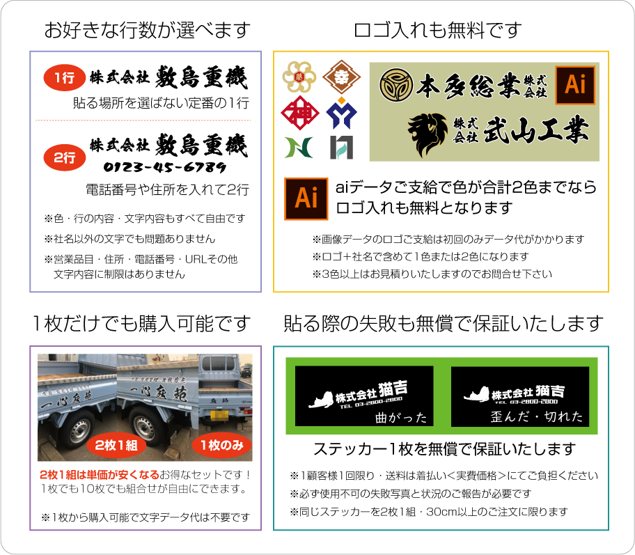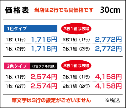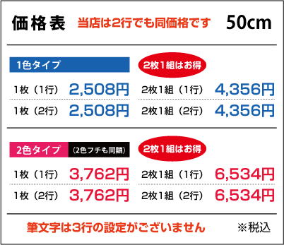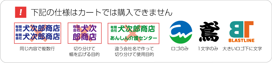 ■2行でも同額のため「切り離してのご利用目的の内容など」は禁止とさせて頂きます。また「ロゴのみ」「1文字のみ」「ロゴがメインで文字が小さい」などは別途お見積りをさせて頂きますのでご了承ください。