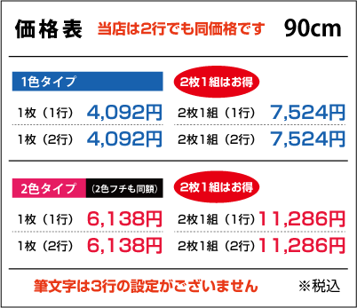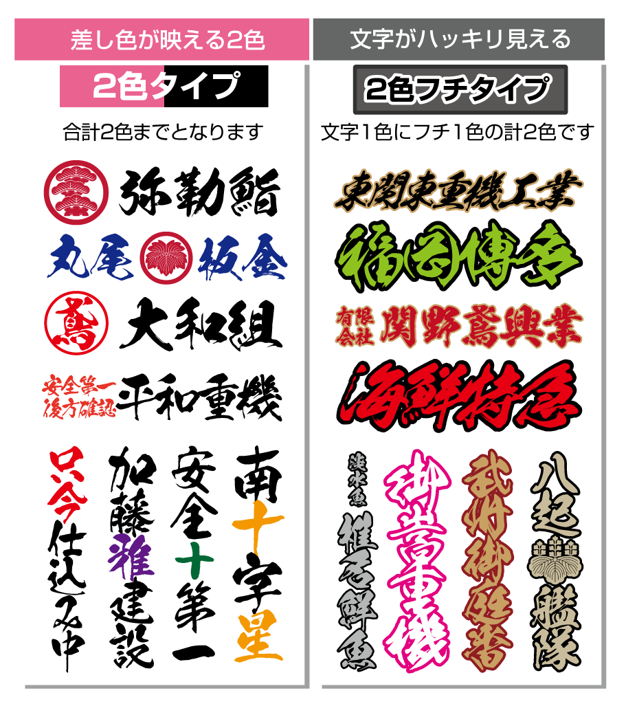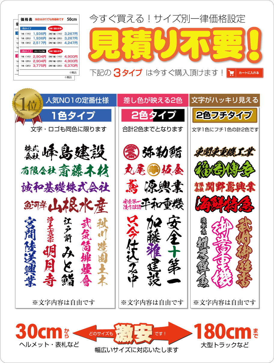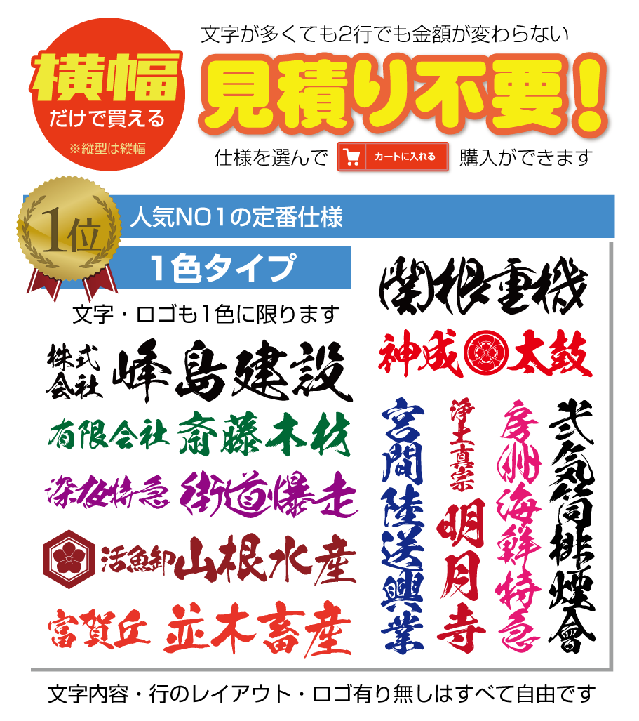■「スタンダードな1色タイプ」「ロゴと文字で合計2色までのタイプ」「文字1色+フチ1色の2色フチタイプ」の3つが見積り不要で購入可能です。色や文字内容・行ごとの文字内容などはすべて自由です。(上記以外はお見積りをさせて頂きます)