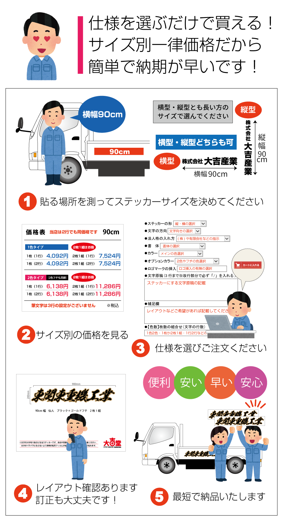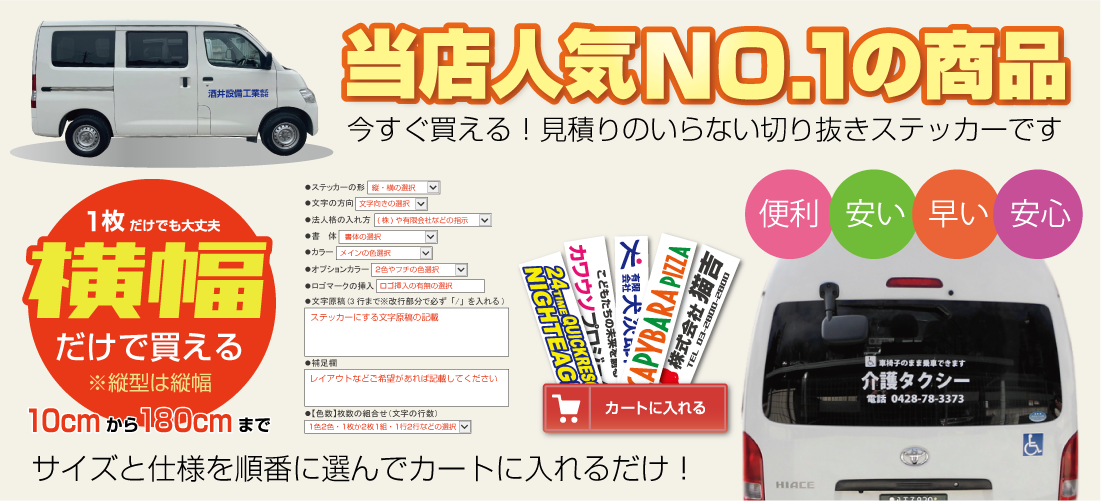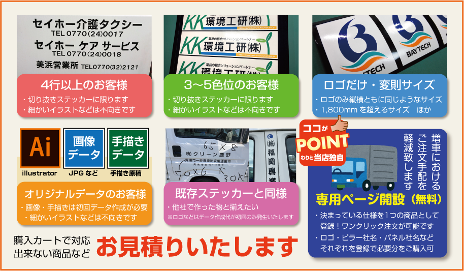 ■お見積りの際は必ず「サイズ・数量・色数・希望事項など」をお知らせください。「軽自動車や2tトラックサイズ」などで指定を頂 いても貼る場所や車種によりサイズが違うため「必ず希望サイズ指定」をお願いします(幅か高さの一方で大丈夫です。※高さに制限がある場合は〇〇cm以内などもご指定下さい)なお1シートで出せるサイズが長い方2m×短い方57cmとなります。お見積り時のレイアウト提案は行なっておりませんのでご了承頂ければ幸いです。