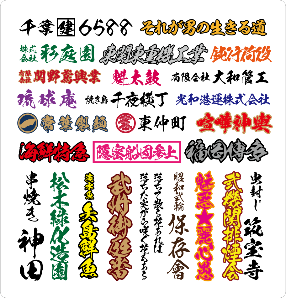 見積り不要!筆文字ステッカー・筆文字カッティングシート・筆文字・切り文字ステッカーです。トラック・ダンプ・デコトラ・営業車・軽トラ・会社名・社名・シール・ステッカーカッティングステッカー作成・マーキングフィルム・切り抜き・筆文字・ステッカー