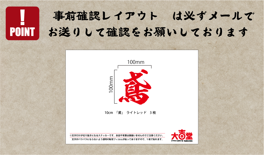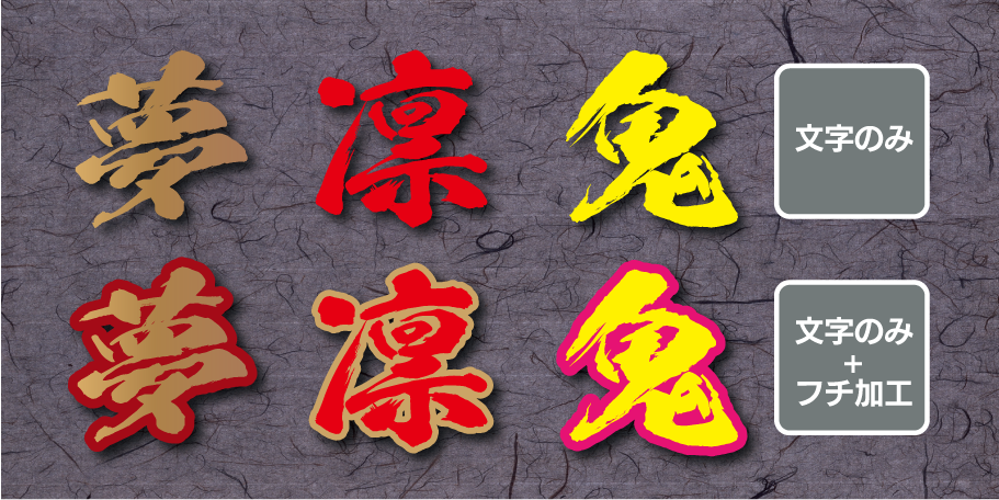 サイズは5cmから58cmまでカラーは35色、文字は好きな文字を指定できます。鬼滅の刃でも使用されている筆文字です。基本的に「陽炎(かげろう)」という書体を使いますが特徴的な筆文字につき、お客様の文字によって合わない場合がございます。その場合は当店の判断で書体を変更しています。(文字レイアウトは必ずメール等でお送りしてご了承を頂いてから製作しております)