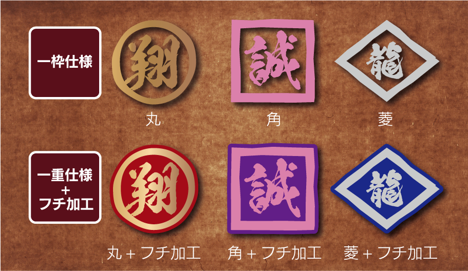 さりげない一重丸一重枠の仕様になります。装飾がある分文字サイズは小さくなります