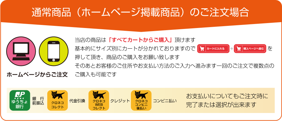 「前払い(銀行振り込み・クレジット決済)」のお客様はご入金またはお手続きを頂きましたら、次の工程へ進みます。「後払い(代金引換・クロネコ後払い)」のお客様は、続けて次の工程へ進ませて頂きます。