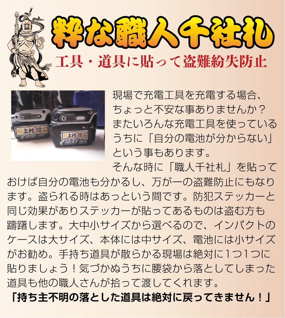 「転ばぬ先の杖」それが職人千社札です。多くの職人さんが入る現場では道具や工具が煩雑になりがちです。悪意は無くても同じメーカーならうっかり間違えて持っていく、充電中の電池が間違って持っていかれるなどトラブルが多くあります。自分の持ち物にはしっかり千社札を貼っておきましょう!職人さんからのリピート率NO1商品です。「屋外・水濡れ」問題なしの完全防水仕様です