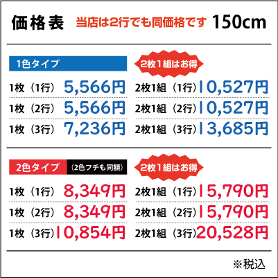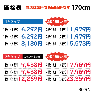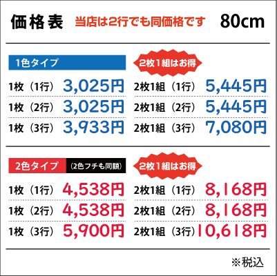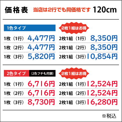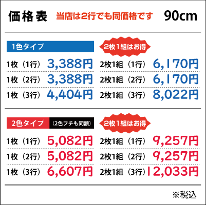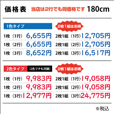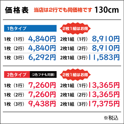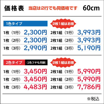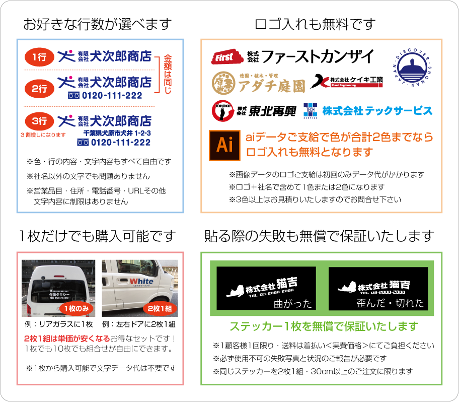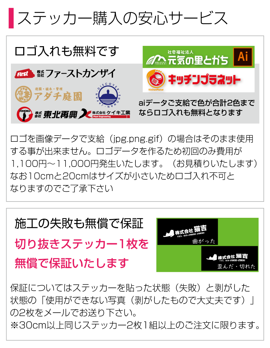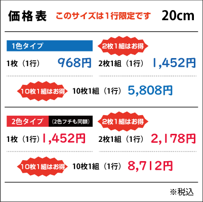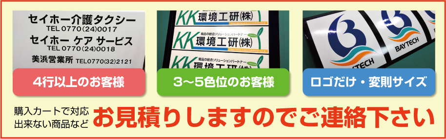 ■2行でも同額のため「切り離してのご利用目的となる内容など」は禁止とさせて頂きます。また「ロゴのみ」「1文字のみ」「ロゴがメインで文字が小さい」などは別途お見積りをさせて頂きますのでご了承ください。なお切り分けてご使用頂いた場合は、いかなる場合でも保証は出来ませんので予めご了承下さい