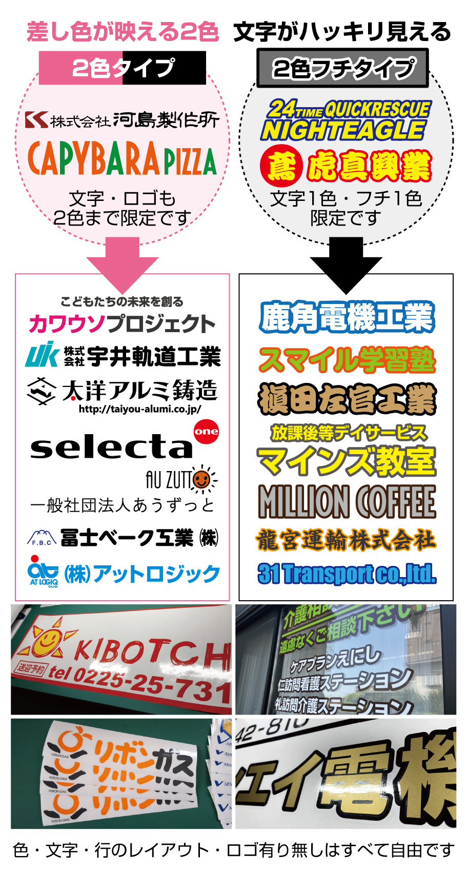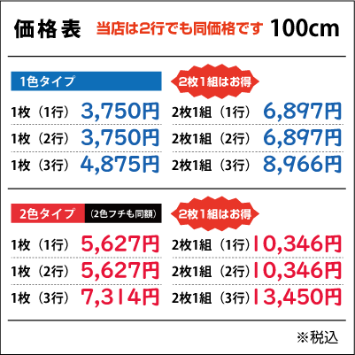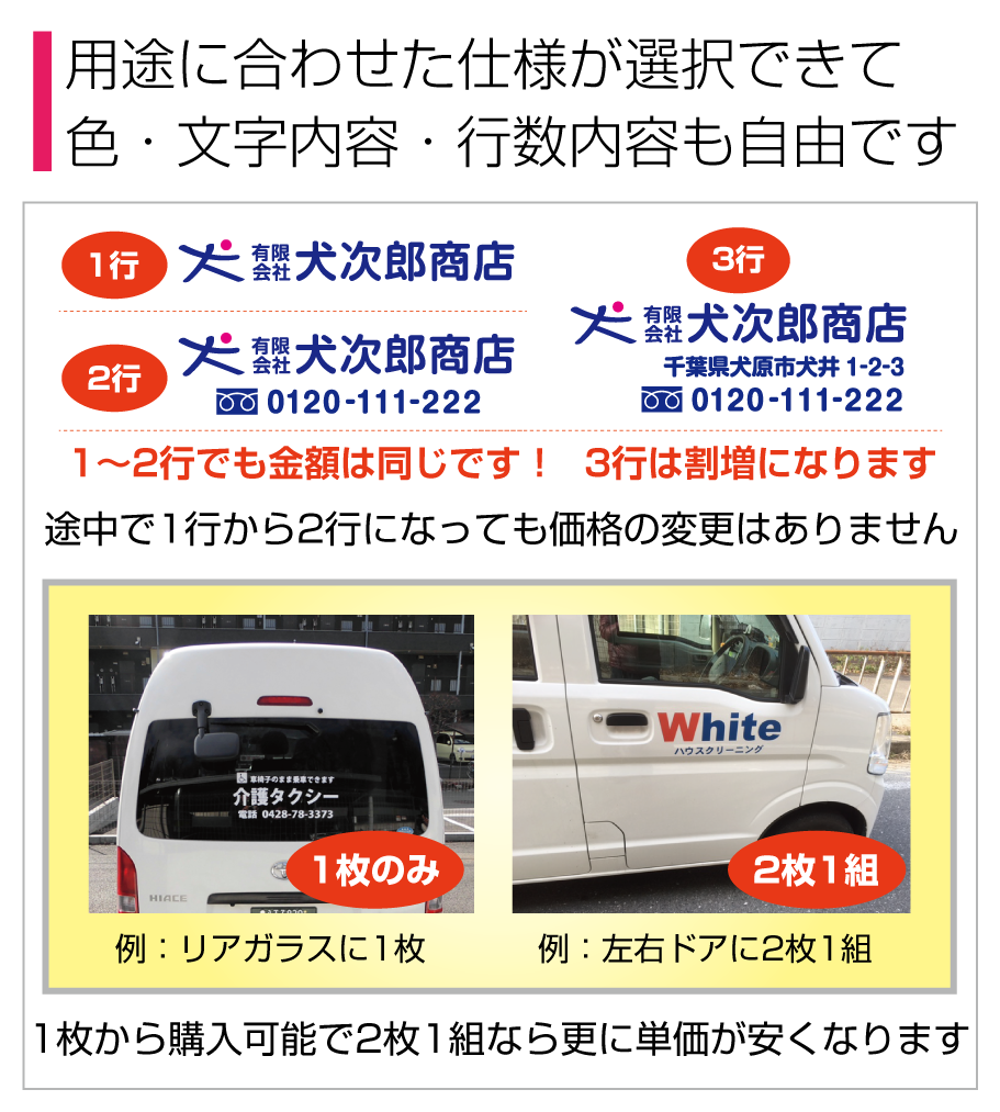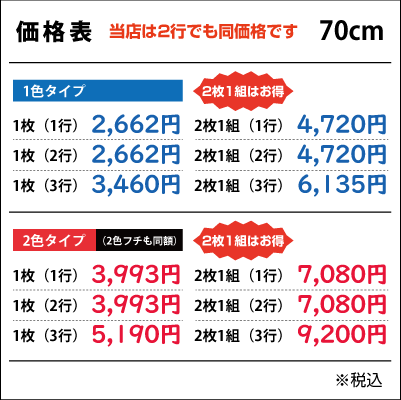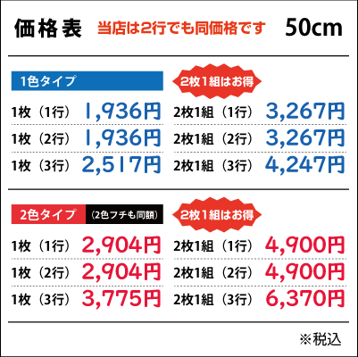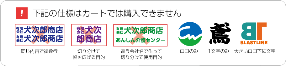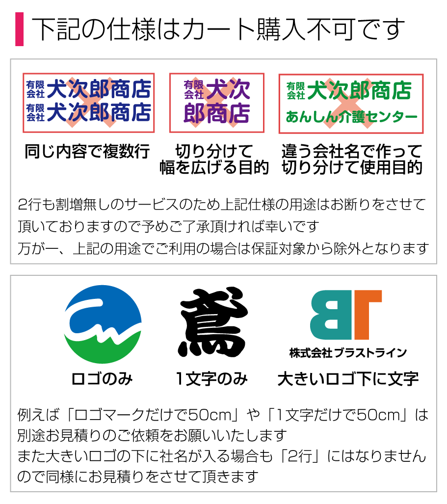 ■2行でも同額のため「切り離してのご利用目的となる内容など」は禁止とさせて頂きます。また「ロゴのみ」「1文字のみ」「ロゴがメインで文字が小さい」などは別途お見積りをさせて頂きますのでご了承ください。
