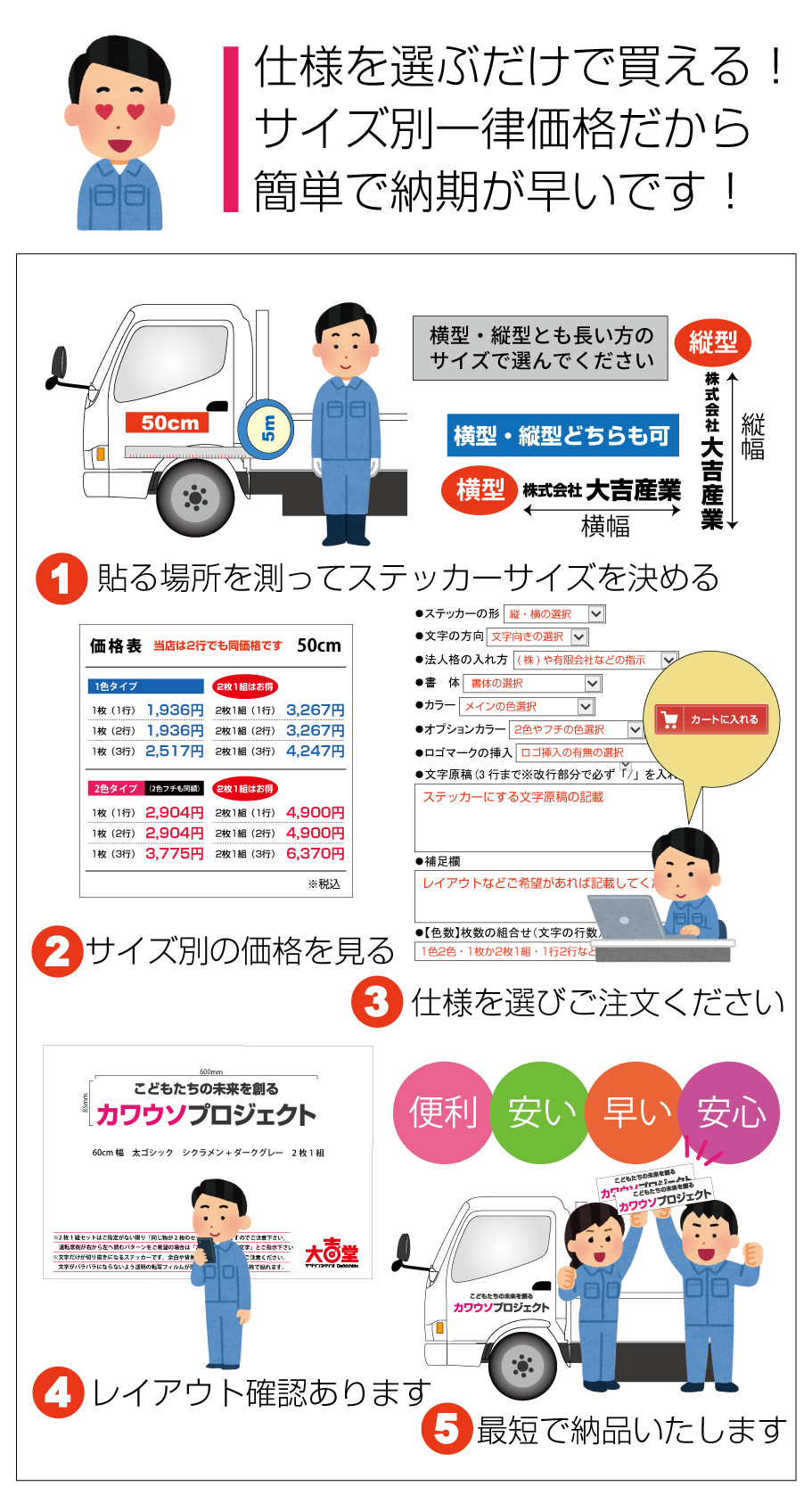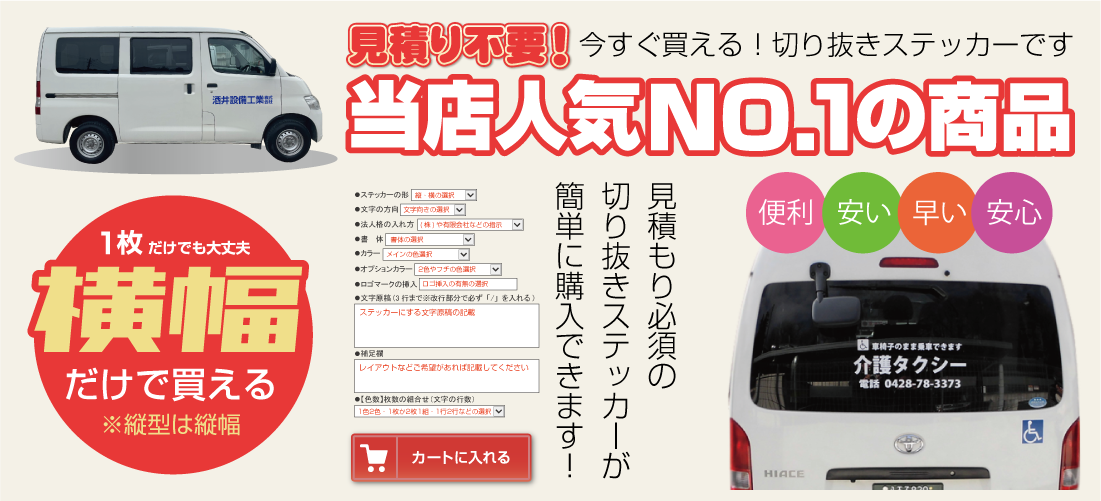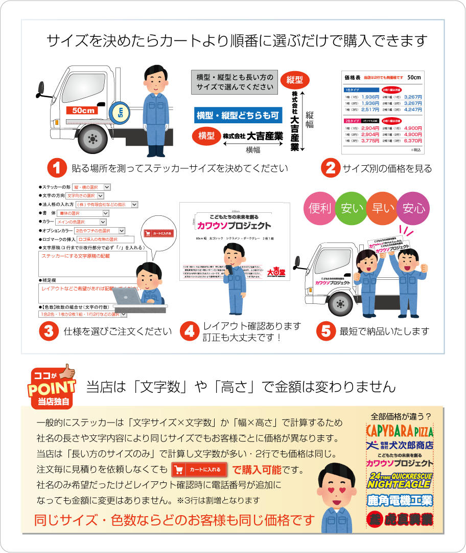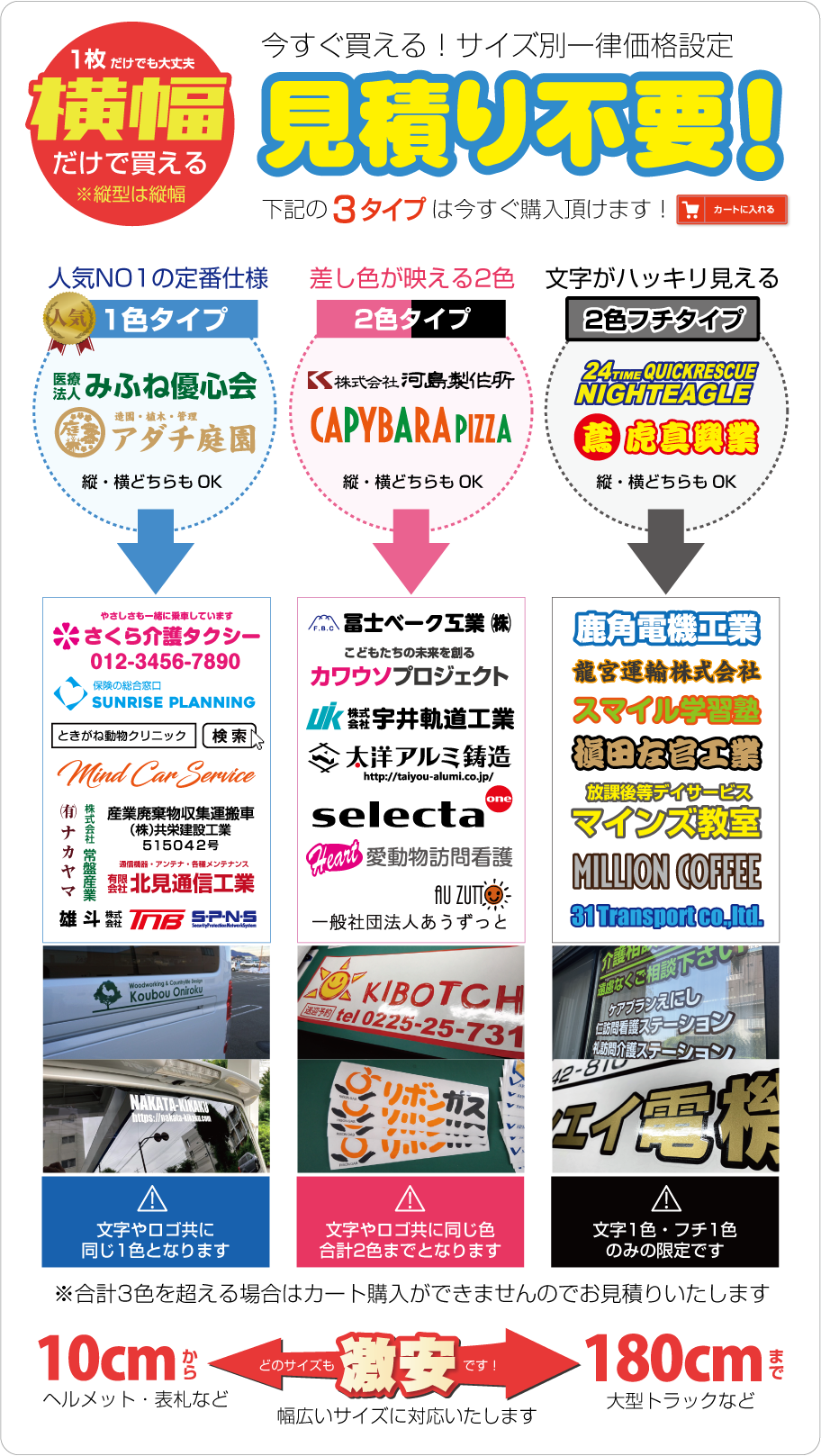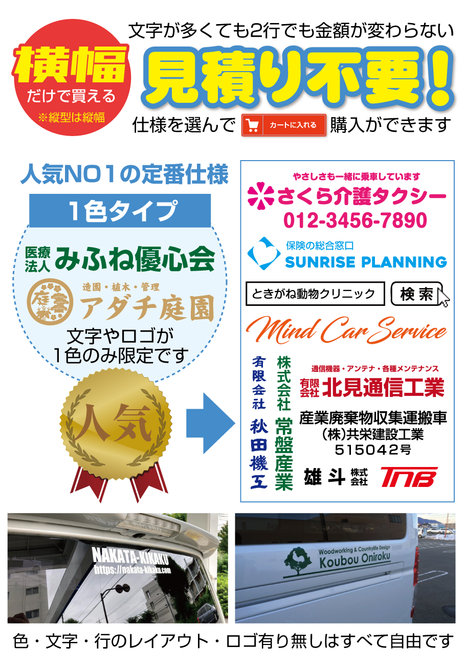 ■お見積りの際は必ず「サイズ・数量・色数・希望事項など」をお知らせください。「軽トラックや2tトラックサイズ」などで指定を頂 い てもサイズの確定が当店で出来ません。貼る場所を決めて「必ず希望サイズ指定」をお願いします(幅か高さの一方で大丈夫です。※高さに制限がある場合は〇〇cm以内などもご指定下さい)なお1シートで出せるサイズが長い方2m×短い方57cmとなります。
