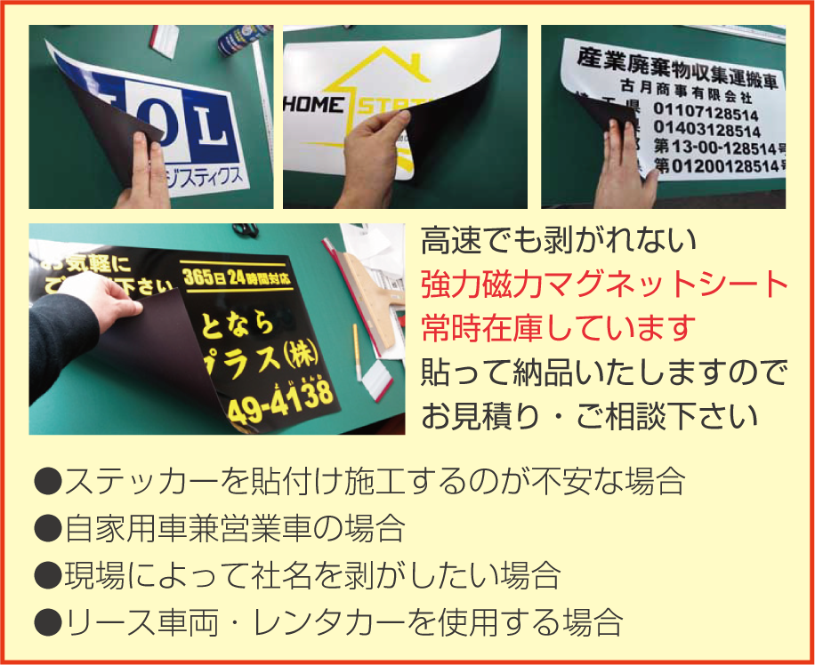 100均や量販店のマグネットシートは走行しているうちに気が付くと無くなっています・・こちらは強力磁力なので高速走行でもビタッと貼りついてます。建設系のお客様で現場によっては社名を出せない場合、自家用兼営業車の自営業者さんにおススメです。