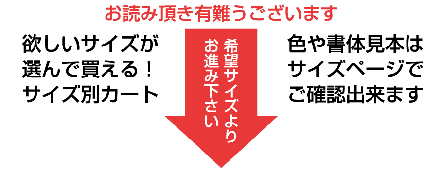 「書体見本」「カラー見本」については各サイズの購入ページに掲載をしております!